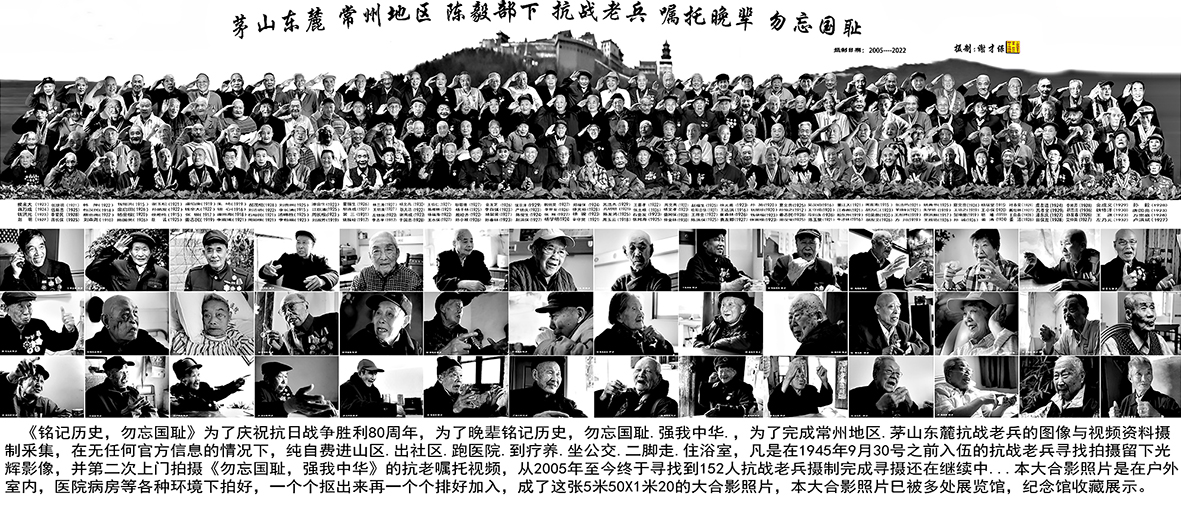 2017迄今在无一点抗日参战老红军的讯息质料前提下自付自寻拍好抗日参战老红军153人拍照及第分次补录视频图片质料。並将152位抗日参战老红军组合构成成一整张5米50X2米20的大全家福像片拍照,免费写给陈毅新四军纪念物馆,茅山盐湖城黑色纪忆馆等一处展览中心长期性表现。