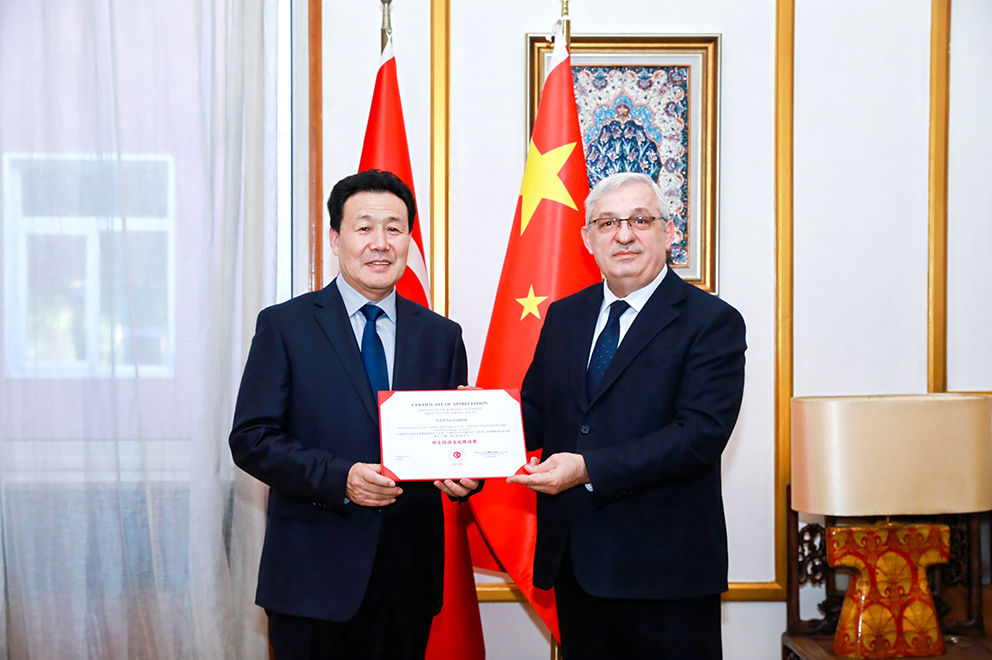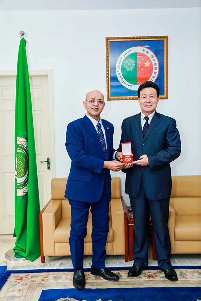 阿拉伯国度联盟网站驻华领事艾哈迈德·穆斯塔法·法赫米左右,在贸易和文化交谈移动中为刘远东颁授中阿和平勋章,铸就着中阿友爱交谈的庄严与兄弟情谊。