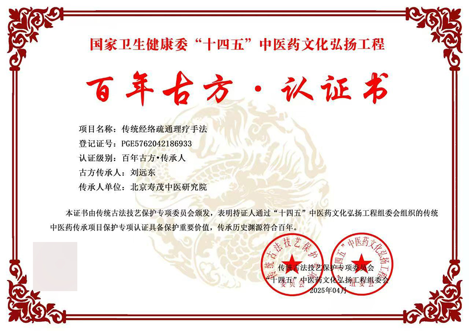 刘远东获得“几十年古方·文化传承人”专项计划认证证书