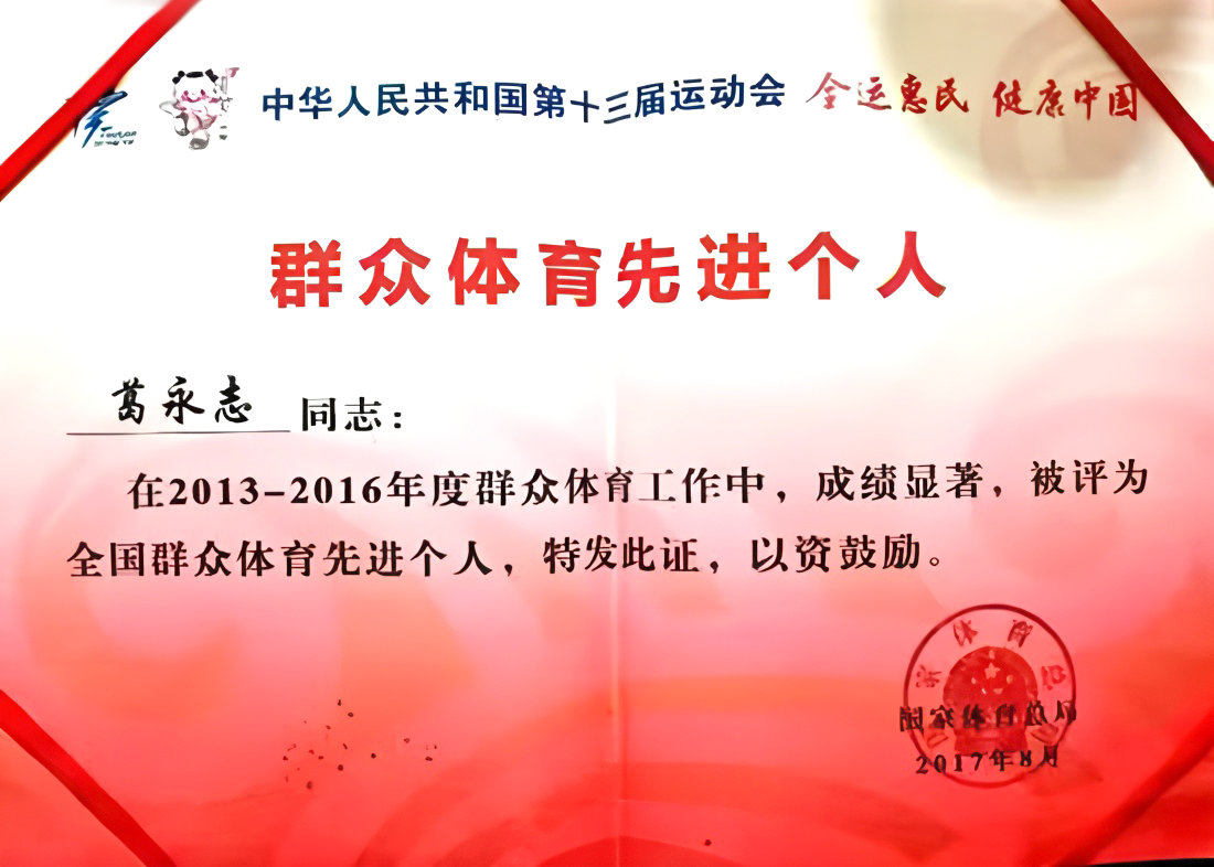 喜获第九八届、第九九届中世记大采风活动年中角色暨CCTV 影视几大新闻有关资料人们角色、国庆献礼中华民族香烟人民70华诞之守信修建修建促进突出贡献荣誉、守信修建我国公益的活动品牌外貌使者、最具直接感染力特色古文化幼教异魂领军伍物人们角色、《中华民族香烟大师网》相关业百杰、中华民族香烟武术队合理创新转型奖当选我国直接感染力人们角色比对数据源库库和我国相关业学者人才库引进比对数据源库库,应邀就职 CCTV 第九九九届我国个世纪大参观、二是届央视了大卫生高点luntan品牌外貌使者,入编《共筑我国梦--特殊纪念开国70 周年华诞,海外内 70 位出色民企工厂家肖像邮册》,被认为 2019致富我国经济转型许昌luntan“我国武林非遗百名荣誉人们角色”,其参考文献先后顺序获得 2013 我国军事体育非成分特色古文化幼教财产学术界多而甲等奖、第九九六届我国合理家luntan甲等奖、二是届我国过去的特色古文化幼教异魂与转型高点luntan暨伟大成就感(成果展)展特等奖。获得我国老龄人学懂得授予的合理养生保健事业上的“終身伟大成就感奖”。到庭 2019 我国幼教影视台《悦维战斗力点着但愿第四届日光美少年大规模公益的活动星光盛典》,山东省永京拳武林深入分析会获“爱机关单位”名称。202三年 2月,葛永志女士入选首位卫生有关资料“卫生人才库引进榜”。