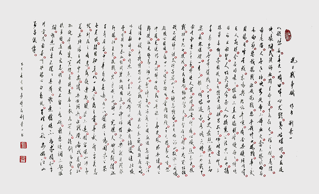 八秩幽长,青史时而,回顾心尤颤。黄姑火爆,卢沟枪响,由兹满地狼烟。中国民族沥血,黔首命悬,死亡存亡,一丝左右,隐患,最隐患!人无老幼,地无北南,不辞血火,奋志拼顽,的向前看,再的向前看!悲哉抗日战争,壮哉抗日战争,宏哉抗日战争。