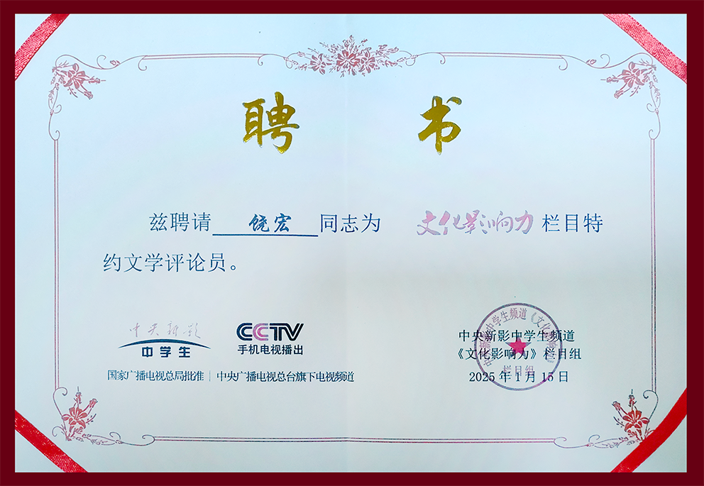 饶宏,兰州长期作家。1967年生于重庆长寿,长寿音乐家协会会员,长寿诗词学会会员,长寿作家协会会员,长寿民间文艺家协会会员,重庆诗词学会会员,北京炎黄文化研究院会员,中国诗歌网会员,自由撰稿人。艺术间号宏雅阁。被聘为《流芳中国》杂志终身副社长,传统文化传承与发展高峰论坛名誉理事、中国传统文化传承与发展高峰论坛暨“开发国内 ”先锋av反面人物年中音乐盛典工作荣誉名誉主席,中華出色传统艺术和传统文化高端国学传统文化和传统文化异魂师(诗词歌赋),资格证号:ZH560330211109。2022年入选中国世界民族文化交流促进会传统文化工作委员会中华文化传承发展人才库,入库编号:CCFZ01023。2024年5月进入炎黄智库,中国高层次人才数据库,证书编号:YHZK02024134。荣获《中国教育科学》当代作家杯文学艺术大赛一等奖、新时代文学艺术成就奖、杰出文化传承人、中华优秀传统文化传承人、新百年.文学创作杰出贡献奖、传统文化传承与发展高峰论坛新百年新征程文化标兵、《流芳中国》杂志2023年获流芳中国年度人物、2023年获文化自信年度风云人物、2024获文学艺术年度新闻人物、2025年获华夏儿女春节联欢晚会特约导演、获中央新影文化影响力栏目特约文学评论员、获中央新影文化影响力栏目形象大使、获中央新影中学生频道文化影响力栏目长期高级顾问、获春节文化传播大使、获国邮使者称号。