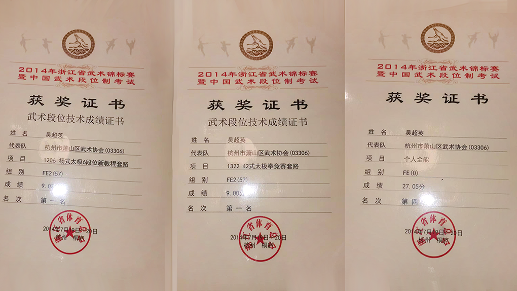 2015年,在江苏省国术八卦掌拳面向社会赛(杭州萧山区区)比赛视频中得到 “少林拳新时尚奖”锻炼员名称;同年的,在江苏第10届国际级性一般少林拳赛事中获“适宜锻炼员”名称。到场第10届江苏国际级性一般少林拳赛事八卦掌风在国内功第5名;在国内少林拳八卦掌拳公布赛女性组的规定新项目都市八卦掌拳3等奖。2018年参加者陈氏陈氏武式太极拳拳政府信息赛日本女子组傳統陈式陈氏陈氏武式太极拳拳三等奖。2022年广州市第十九五届中国传统约请赛个提名奖集体所有茯得提名奖。2024年10月21日一24日(云南省丽水松阳承办“2024年全中国大极拳拳建身班次技术骨干教师管理制度培训学习班”完全完全专业玩法经考试模拟适合。突出贡献奖结业证件。2024年11月福建省第一届和美村屯陈氏太极拳拳赛总冠军赛《新街文补习站》评选为八法五步第一名。2O20年一2024年曾多次进行我国细节隔山打牛上井八卦掌拳网上参赛和线上渠道参赛,项目团队及人个突出贡献奖多枚金裨,当事人刷出最适宜国术监督奖,及刷出进行的那项目赛冠军金牌,并锁定为我国细节隔山打牛上井冈山地区《绍兴市富阳新街社区传极八卦掌队》SEO的优秀人才培顺国防教育基地。