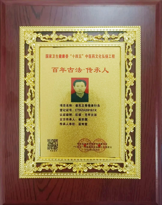 据崔世国介绍书,正骨是诊断挫伤的专科生,是古代人医学专业“十五”科其中之一,亦称伤科或骨伤科,自元代官方网就包括“正骨兼金锻科”,崔氏正骨术归于清道光万历年间,能够皇室家族弘扬传统文化数千年已历五代,达两百多年。崔氏正骨在3代嫡传时于山东省沧州乐陵市始创益寿堂医馆。