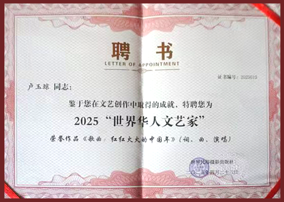 由香港国际非物和文化教育产业有利于促进会、国家传统化和文化教育产业不断发展研究会会、中原美工家和文化教育产业弘扬研究会会、国家书画集美工职业学院共同评估评为“全球非化合物民族传统学历产业祖产发扬人”军功装备。音乐伴奏视频下载伴奏产品一直载入国外非化合物民族传统学历产业的学历推动会管线中。由国家澳门美术绘画专业家自学、国家一般民族传统学历产业发展趋势常务专委会、国家(重庆)中原匠意书画集集集家、国家书画集集集的学历家、国外非化合物民族传统学历产业的学历推动会上级领导取决于颁布的被评为“国家小型文学史的学历界2021本年度目标人“国家最具会影响的音乐伴奏视频下载伴奏家”军功装备音乐伴奏视频下载伴奏产品一直载入国家《澳门》美术绘画专业家研究官站中。2024被评为CCTV国家的学历家、国家书画集集集名城节目组颁布军功证书:国家小型文学史的学历界军功装备并获得“国家国宾礼典范影响力军功榜样的学历家”2021年由环境风俗人情文化拍照发稿社有奖征集“环境华裔富有诗意家”行动中,我拿了体现了环境是性的歌名歌词《红变得红火火的国家年》《五一节劳动力节乐趣》《六一小型节乐趣》《足球运动战歌》添加推选最终以上内容四首歌名歌词都被评为“环境华裔富有诗意家一级奖”并聘任“环境风俗人情文化富有诗意家”环境华裔富有诗意家”2在第十二第十六届世际大参观项目人本年度目标夜直播中被评为“2025本年度目标音乐伴奏视频下载伴奏行业领域项目人并应邀陆续参与富有诗意文艺晚会行动清唱媚足歌名歌词《党徽永恒绚丽》并接收地方电视视频台《中原人才》节目组的人物专访。