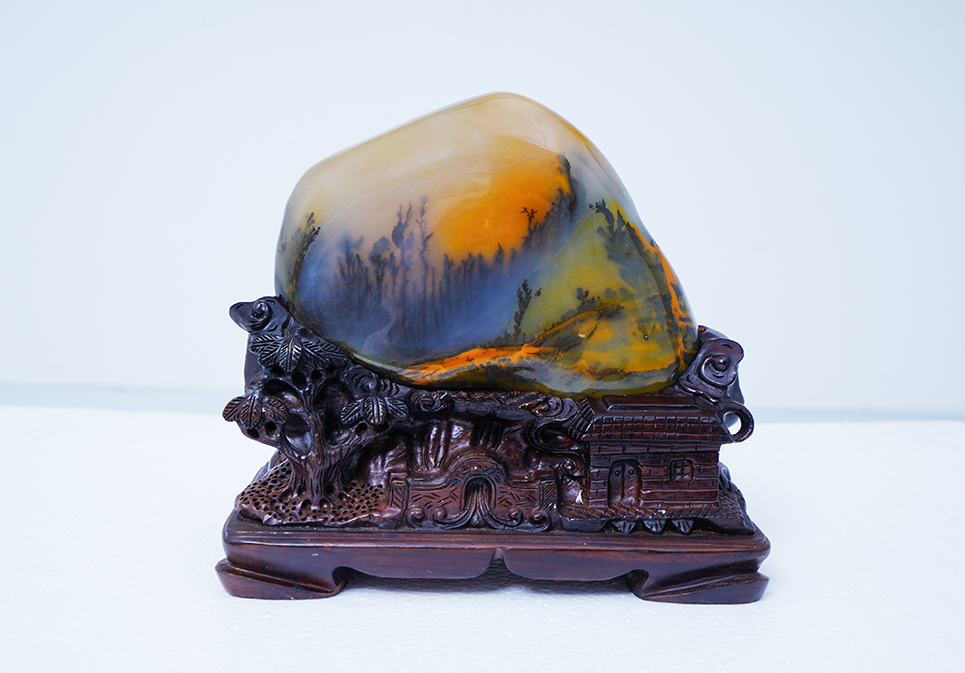 题名:晨林尽染;石种:纯本身黄龙玉水草植物花;长度:22cm*15cm*8cm