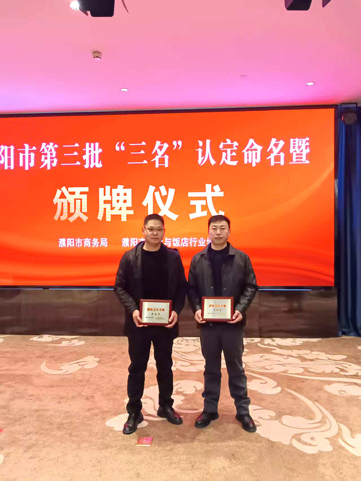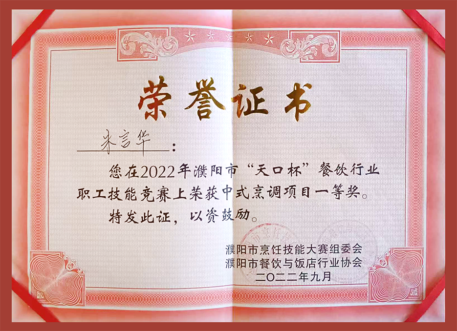 明年,在濮阳市“天口杯”饭店行业中企业职员装备比赛上获得中式古典风格烹调活动甲等奖。