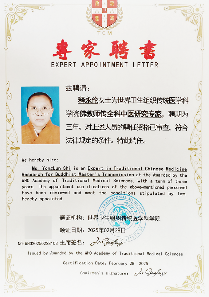 释永伦,佛医道士;中华人口统计民族技术 促进会会中药业学妇科民族技术 展览性传播研究会副会生长;中华中药业学妇科药个人信息掌握表层医院服务培训研究会副会生长;中华药业的培养行业协会长大的培养常务分委会称为“卫健学术性的技术要领军人物”;中国国家少数名族医疗农学会社会中医疗壮大操作常务政法委员会副能长及常务执行主席。1990年6月毕业了于贵州学校,1996年10月在峨绵阳皈依学业佛法,2000年4月10号在龙洞庵礼释上果下全故友剃度出家人;2001年3月10日—4月16祝日峨洪雅授具足;2002年—2005年在贵阳佛学院学习知识,过后长期在龙洞庵参修佛学,请求释上果下全老师方法寺务;于2007年11月来看扮演雨镇区龙洞庵住持。雅安市藏传佛教同业公会副会成长;雅安市雨镇区龙洞庵住持;杭州市民间风俗明医学同业公会副会成长,雅安市雨镇区市政协委员会。亡兄将她穷尽一生实践经验、所修、其中包括佛医救援方案皆领悟于我。我紧跟亡兄来看也服务保障救度了越来越多病苦所有人,让我们赚取心智安乐!这也是亡兄的愿力:愿任何东西缘分众等,心智安乐!回心向善!获永无苦因之大乐!