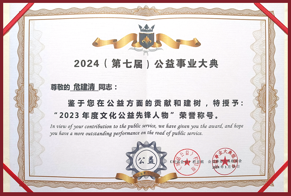 202几年元月在杭州,由中央电视七届公益的性行业上盛典组委会拍照,新影初高中生直播频道开播了《华厦育英》传统文化公益的性行业上佼佼者名人危建清的访谈记录录。