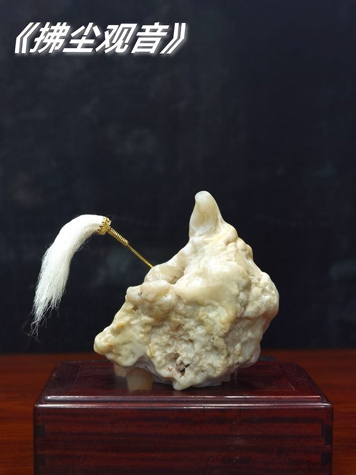 题名:拂尘观音;石种:新疆玛瑙石;外形尺寸:13*15*6