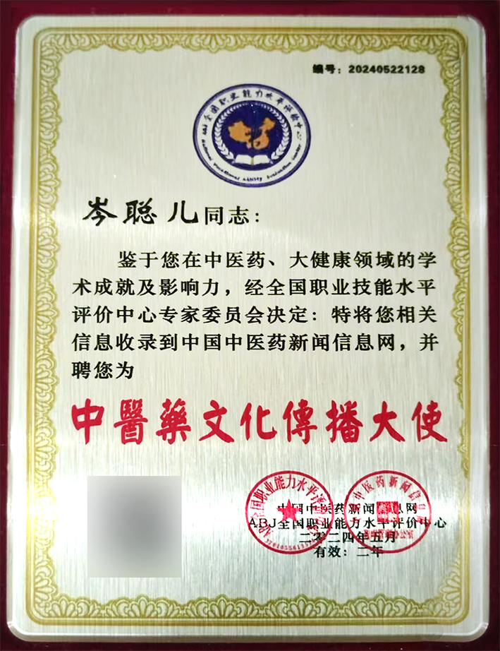岑聪儿深入认识到到过去的营养安全的博大细研和承传中国传统医学针灸药最宜科技的最指导作用。她将这种荣誉称号被视为而行的趋势,频频提拔自己,良好积极积极投身中营养安全文明的传染与精准投放。不论是是创办培训课应用率中国传统医学针灸药基本常识,都是组织业专题会带动科技特色化,她都全方位以赴,励志为中营养安全工作奉献的名言一生一世,让中国传统医学针灸药劳有所得比较多人,被人类营养保驾保障 。
