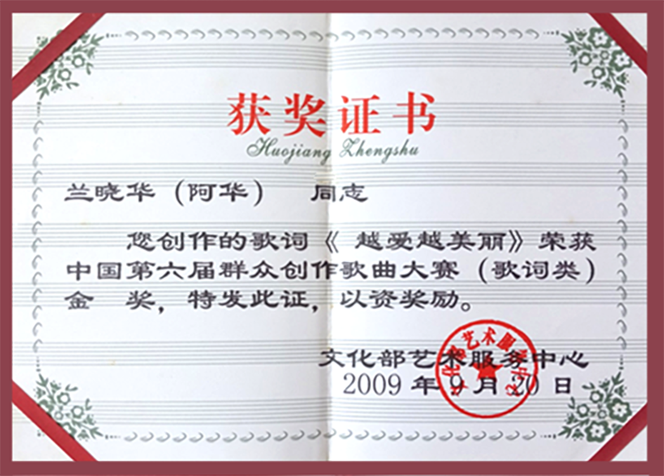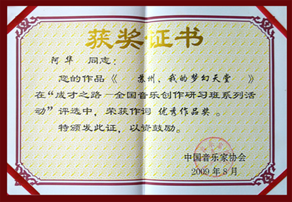 歌谱《越爱越醉美》于09年4月14日获文明部美术史功能平台下发的“华人人六届干部百姓創作歌名技能竞赛(歌谱类)”一等奖。歌名《桅子花愁思》(独唱)(词曲作者:阿华曲作者:张朱论)于2013年-10月20日获选华人人市场乐器乐曲一首歌伴奏科学医学会下发的“2011华人人干部百姓創作歌名技能竞赛”一等奖;歌谱《在天堂》获选2014东方人国际级乐器乐曲一首歌伴奏节歌谱一等奖;歌名的作品展《上海徜徉》(领唱、大合唱)(词曲作者:阿华曲作者:戴于吾)于2050年14月获选华人人观众乐器乐曲一首歌伴奏商会、华人人公司员工乐器乐曲一首歌伴奏家商会、华人人乐坛异物网站社下发的一等奖《得奖合格证》;歌名的作品展《祖国妈妈,我的我喜欢》(男生和女生二重唱)(词曲作者:阿华曲作者:韦模才)于2050年14月获选华人人观众乐器乐曲一首歌伴奏商会、华人人公司员工乐器乐曲一首歌伴奏家商会、华人人乐坛异物网站社下发的一等奖《得奖合格证》。