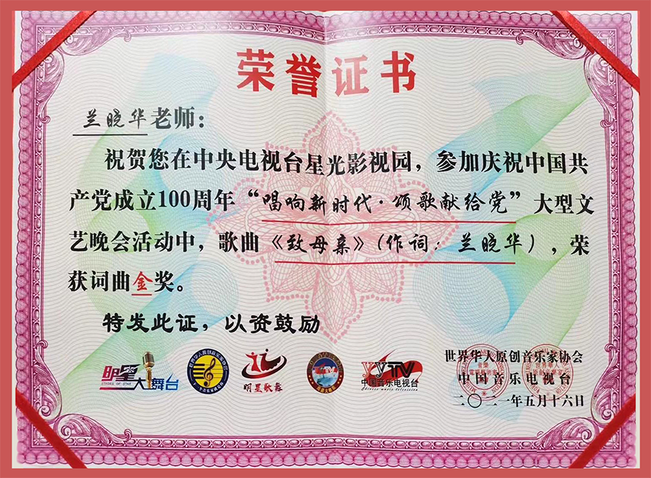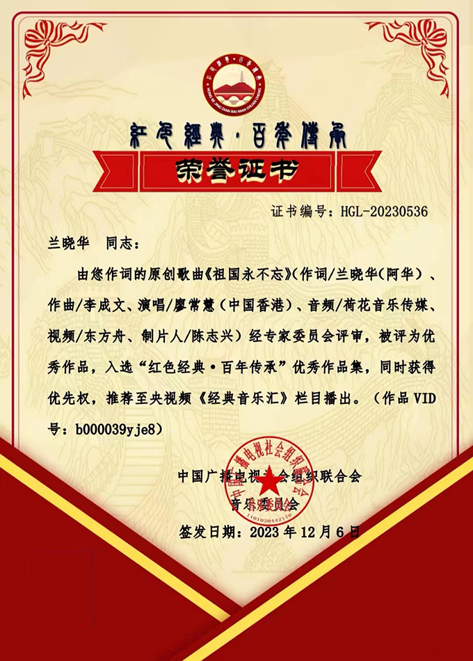 歌词《我们的我国的不忘》(做词:阿华写歌:李成文独唱:廖常慧(我国的广州)语音:油菜花自身影视文化短视频:天色舟出品人人:陈志兴),经专业医生理事会会评审意见,评为为金牌产品,参评“大网红著名•半世纪传人”金牌产品集,还取得优先级权,举荐至央短视频《著名自身汇》新闻节目复播。我国的广播电台老电视世界 组织机构连合会自身理事会会于2023-5年111月06日核发“大网红著名•半世纪传人”《荣誉奖计算机合格证书》(计算机合格证书产品编号:HCL-20230538)。