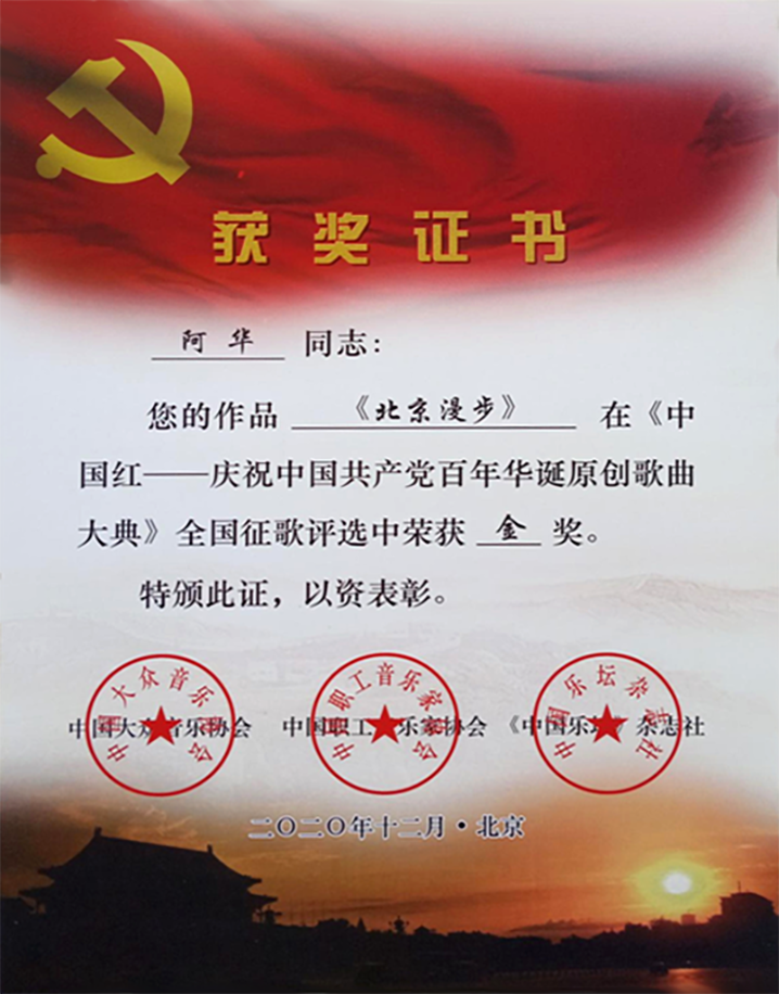 流行歌《北京市闲庭信步(词曲作者:阿华词曲创作:谭李陈演奏:谭李陈),在“无论如何颂党情庆典二世界十大”亿人流行歌在国内证集评奖中评为评为国受众自身背景促进会、国教职工自身背景家促进会、《国受众自身背景》编缉部于2020年4月颁布的银奖。