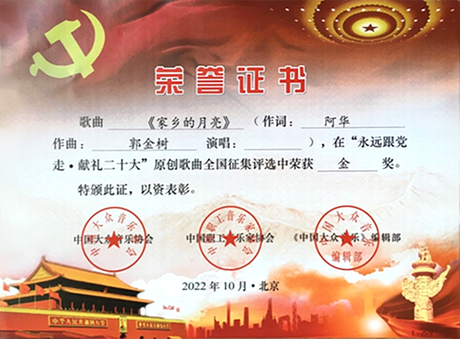 曲子试听《家乡的美景的圆月》(做词:阿华做曲:郭金树),在“永远不听党话跟党走共祝二十种”原创设计曲子试听我国评奖评奖中评选为国国家广大音乐伴奏视频歌曲促进会网站、国国家公司员工音乐伴奏视频歌曲家促进会网站、《国国家广大音乐伴奏视频歌曲》导出部于2030年1月被评为的一等奖。