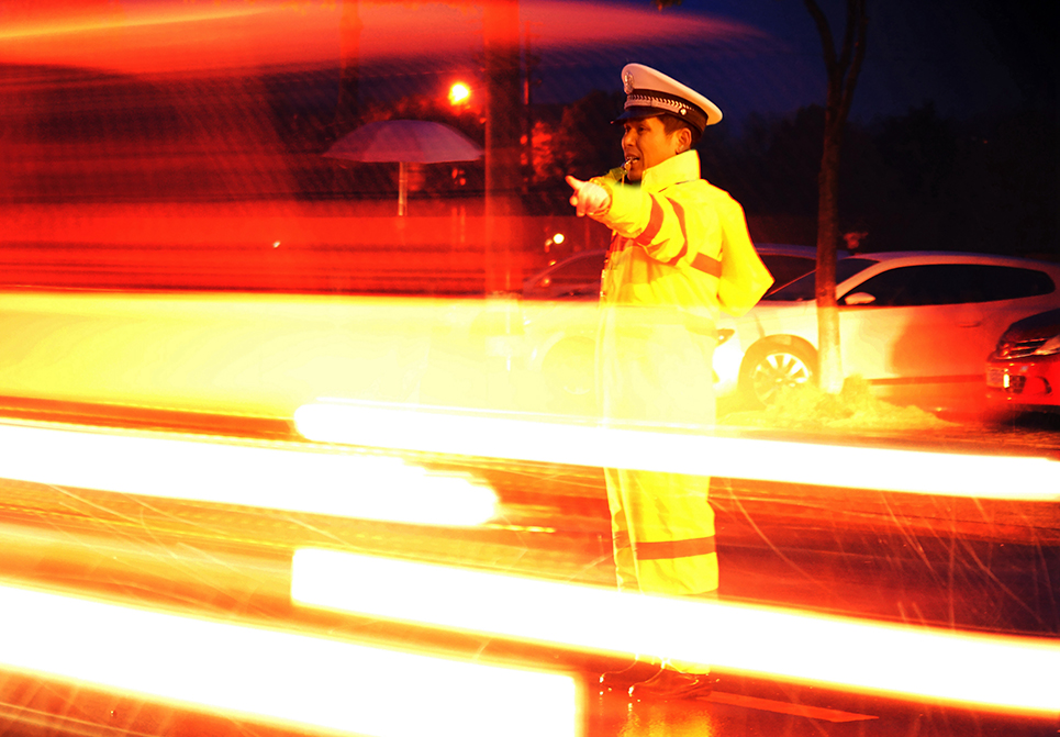 2015.1.27(风雪无阻)高速交警在夜间大雪纷飞天总指挥交通运输. 用我2分之三秒的慢速,笔型屏住吸呼拍下了这张图片视频