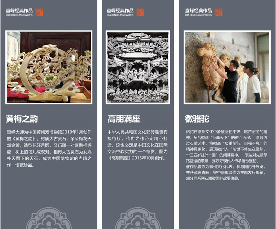 2013 年,查嵘在芜湖新开设了徽州三雕相传了音乐绘画造型管理类院,看作集中化展示台徽州三雕的窗户和交流的活动手机平台,接侍国内国内链和外音乐绘画造型管理类家和癖好者来院探访和专业学习。查嵘还陆续团体创办“第五届国内徽雕音乐绘画造型管理类创作展”,“查嵘名手音乐绘画造型管理类品赏析”等徽雕风格管理展览的活动,在世界 上和文艺工作者界打开徽雕热。多年以来,查嵘陪同他的公司,得益于打造出于仿古房建施工的修护和现当代徽派房建施工的加入,秉持着了芜湖城隍庙创新等关键过程中,在兴建中更加充分加入传统的圆雕音乐绘画造型管理类,打造出都市地标性工程,伟大复兴徽派房建施工现象学。