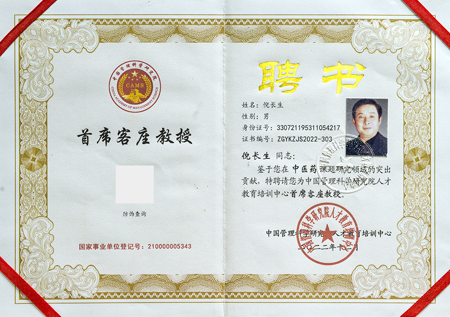 三、用现代科学的原理把祖先留给我们五千年来中医药得瑰宝,不断创新、总结、提升,走出一条属于中国自己的传承之路。 作为中国民间中医药协会八婺分会的会长,倪长生对肩负的振兴中医药使命,深感责任重大,三十年来,他以超乎常人的毅力,超乎想象的努力,超乎寻常的措施,在传承和发展中医药的漫漫长路上,乐于做一个孤独的探索者、杰出的组织者、理智的总结者、科学的实践者,始终秉持初心,在利用好中医药这个老祖宗留下的传统文化瑰宝过程中,不仅赢得了声誉,也给万千病患带去了生命的尊严和渴望的长度。“你的病看来只有找倪长生才有办法了!”这句话,从北京、上海、杭州各大医院专家们口中说出,看似自然,其实更多的的,是一种业内的尊崇、一种认可!倪长生,文化不高,悟性极高。自打他一头扎进对中医药的研究中开始,无论是对中药材的优选种植,还是开设“天鹤堂”国医馆,进而设立有500个床位、专治脑胶质瘤的“长生中西结合医院”;筹备专门推广中医药的世界中医药文化交流中心;创立中国民间中医药研究院,让民间中医药研究登上大雅之堂;他更筹备建设中国民间中医药大学,让深藏功与名的民间中医药高手,给师承为主的民间中医药从业者,有机会得到系统而全面的进修,提高诊治水平;他走的每一步,只是向着发扬光大中医药的目标,孜孜不倦地前行着。对于中医药,随着时间推移,接触的各类病患林林总总,倪长生总结出自己的感悟:中医药的优势在于调理,“病来如山倒,病去如抽丝”,经过调理,达到康复;西医的长处在手术,放化疗,在有限的时间内解决病患痛苦。而真正最终解决问题的,恰恰是中医药。“修复和重建免疫系统,让病人依靠自身的免疫功能达到康复,是中成药的终极目标。”倪长生根据多年接触各种病患的经验后,如是说。因此,在研究中成药方剂的时候,倪长生团队从无数种中药材中,精选出与人体免疫系统有相关联的药材,做不同的剂量配伍的试验,在很长一段时间里,他在自己身上做试验,体会身体的反应,感觉用药前后的变化,筛选出药效最好、互为扶佐的中成药方剂。