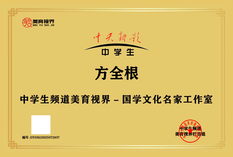 2025年8月2日中央新影中学生频道文创时代栏目组,《名家讲坛》艺术人生专题访谈组委会:在文创时代名家讲坛艺术人生专题访谈活动中,经组委会特别评审甄选,被授方全根予2025年度最具影响力国学名家荣誉证书。荣获:全国示范人物荣誉牌匾。{名家讲坛领军人物}金质奖杯。