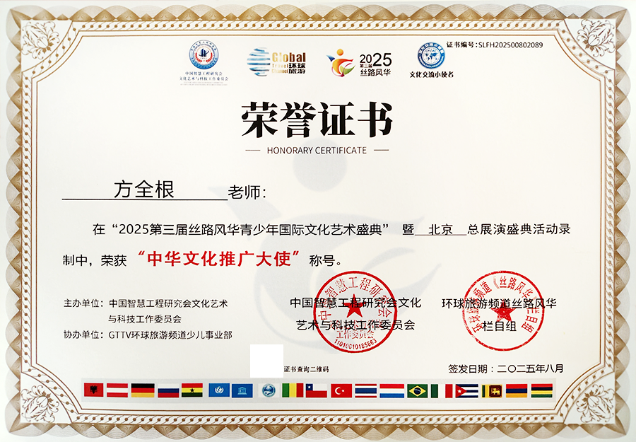 2025年8月9日在2025第三届丝路风华青少年国际文化艺术盛典暨北京总展演盛典活动录制中方全根荣获中华文化推广大使荣誉称号!