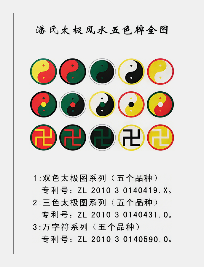 -双色太极图系列(五个品种):专利号ZL201030140419.X,2010年4月9日申请,2010年1月26日授权公告,含黑绿、红绿、黑白、黄白、红黄太极图,遵循五行相生之理。