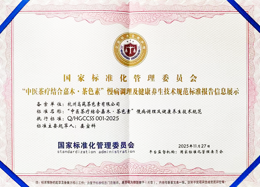 2016年,公司迁至中国首个云生态特色小镇——杭州西湖区云栖小镇,占地2000多平方米的新厂区,依托西湖龙井核心产区地理优势与浙江273万多亩茶园的丰富原料,构建起“原料-研发-生产-销售”完整产业链。从茶叶中提炼高纯度茶色素,不仅实现了茶叶的精深加工,更让传统茶产业焕发新生机,推动行业实现质的飞跃。凭借过硬的产品品质,茶色素系列产品声名远播,杭州高莼茶色素有限公司也跻身茶疗领域标杆企业行列。