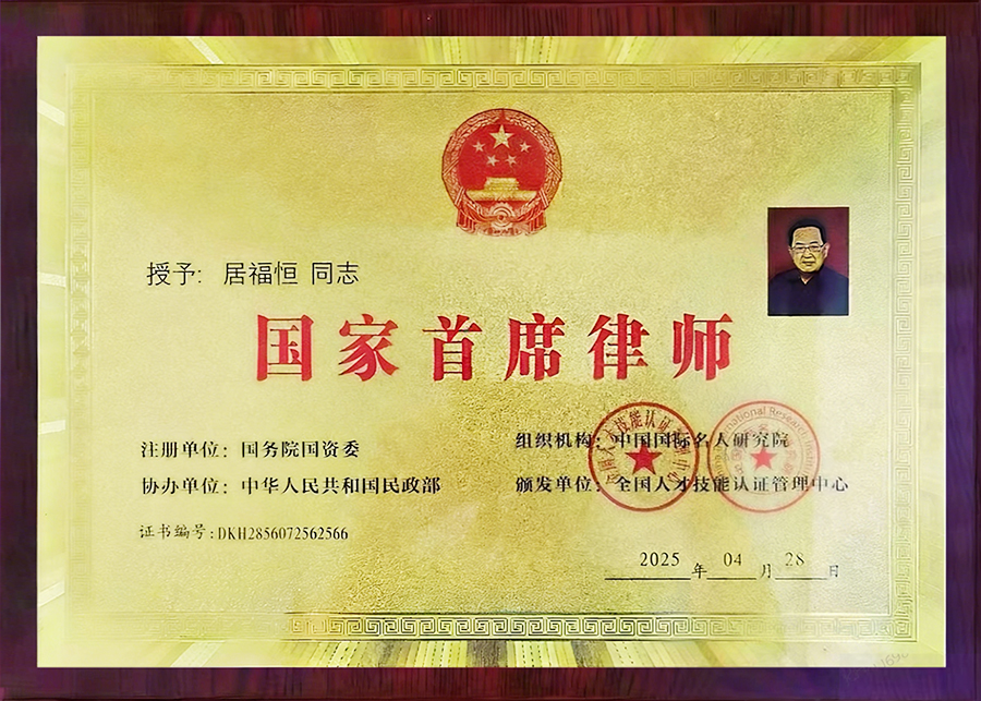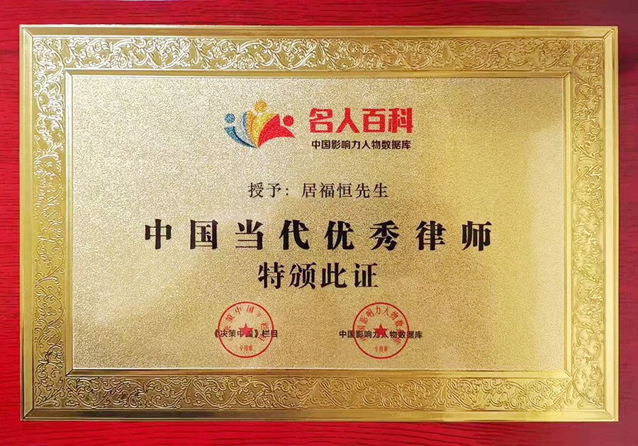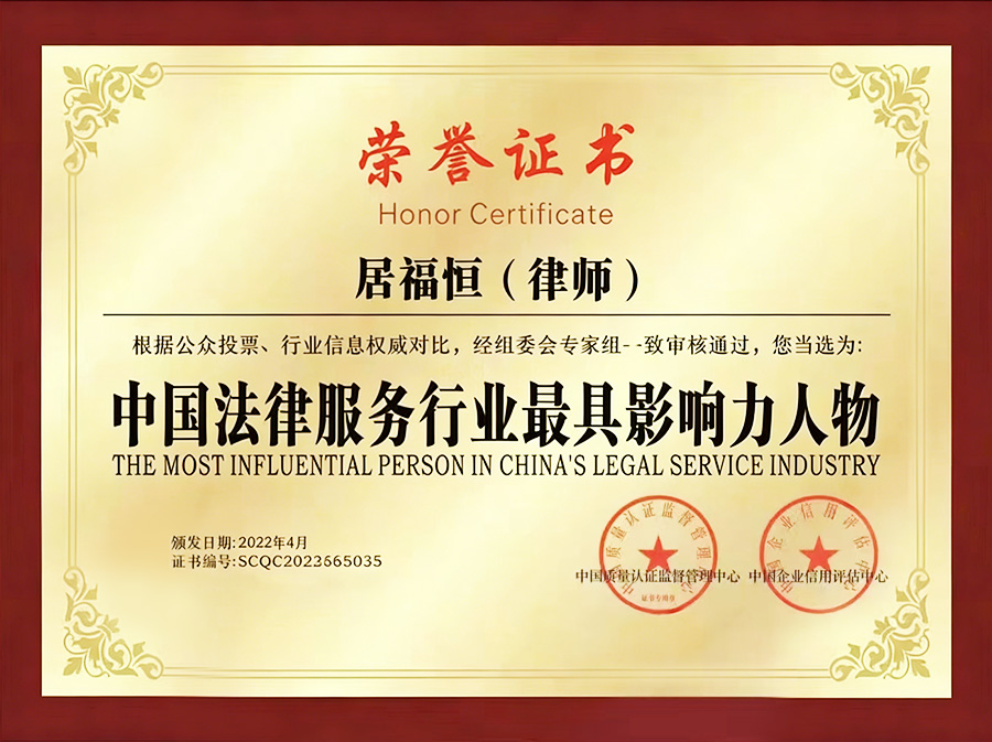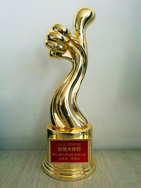 2015年,荣获《第七届世界法商金融大会》影响中国的“百强大律师”荣誉称号。