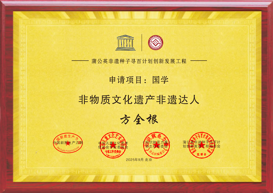 方全根在经典国学特色文化方面的优秀贡献奖,为他争得了诸多勋章: