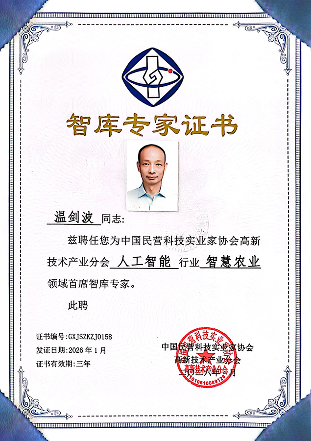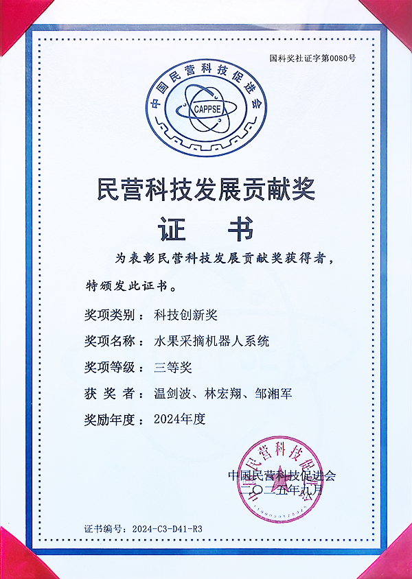 在温剑波看来,工匠精神不仅是技术创新,更是标准制定。他参与了《民营企业科技创新体系评价规范》的起草工作,并成为该标准起草专家委员会委员。他还牵头起草《水果人工智能采摘机器技术规范》团体标准,深度参与了多项行业标准的建设工作。他的著作《人工智能在电气工程自动化中的应用探索》《农业种植与农业机械化装备操作研究》,为行业提供了重要理论支撑和实践指导。2024年发表的《智能移动式水果采摘机器人系统的研究》论文,深入探讨了水果自动采摘机在现代农业中的应用,这些贡献都展示了他的专业水平,也为行业的规范发展做出了重要贡献。