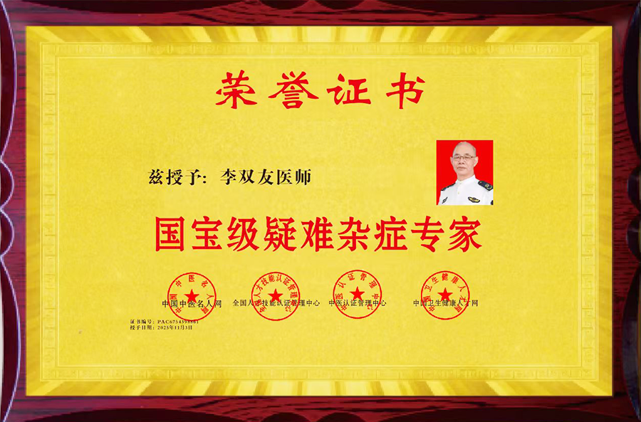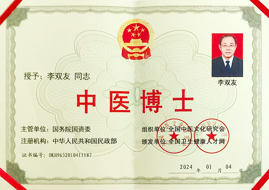 李双友2010年在人民大会堂参加第四届中医药发展论坛,党和国家领导人接见并颁发授予“2009年中医药继承与创新奖”,全国品牌委行业调查专业委员会授予全国首届医学界泰斗暨“医神华佗奖”。
