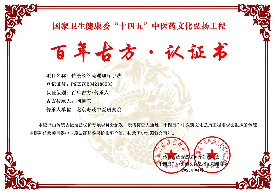 中国食品卫生稳定委“十三四”中醫药文化艺术传承施工给刘远东名师授于“传统与现代经络梳通艾灸养生操作手法”一百年古方身份验证书