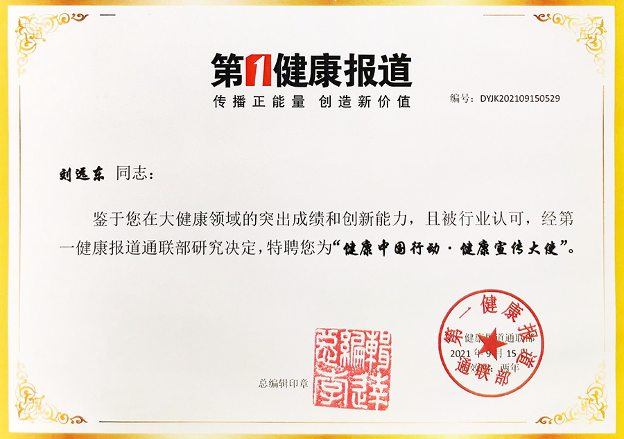 刘远东老师与2021年9月15日被第一健康报道通联部聘为“健康中国行动·健康宣传大使”。