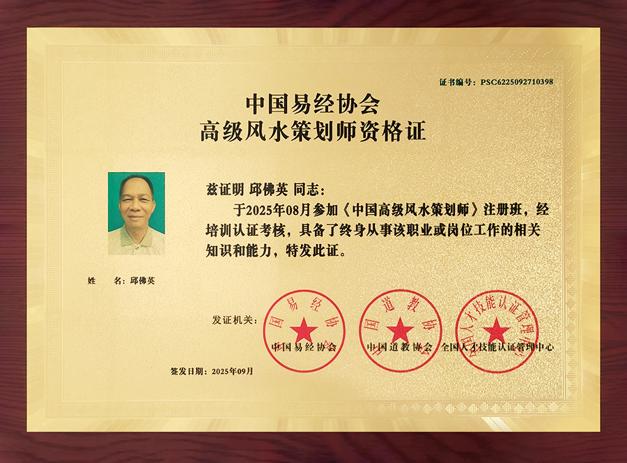 专门课程的熏陶终获公信力认同感,近几改革开放以来,邱佛英主次利用全球多位公信力企业的专门课程业绩考核与评审意见,所获一款型权重级注册计算机证书注册计算机证书:202两年多11月,被我国专门课程技巧人工作商会聘用为易经阳宅学经典国学经典经典权威专家;202几年,主次有我国工作小学科学论述院颁布的最专业阳宅学师注册计算机证书、我国人事市场职位既能注册管理机构点站八字命理命理师注册、国培职位既能检测访谈提纲管理机构点站易经阳宅学师注册,各种学校部学校技巧与市场经济发展管理机构点站颁布的经典国学经典经典与现在学校最专业讲师证;2025年,同时也是一连所获中职教育人測評管理机构点站最专业经典国学经典经典民族特色文化知识教育过去师、我国最专业阳宅学营销策划总监、我国过去民族特色文化知识教育增进会易学民族特色文化知识教育过去师等注册计算机证书注册,还被评为2025年广西阳宅学民族特色文化知识教育馆评选活动特等奖,某一份注册与奖励,全是对其专门课程学习能力的最棒印证。